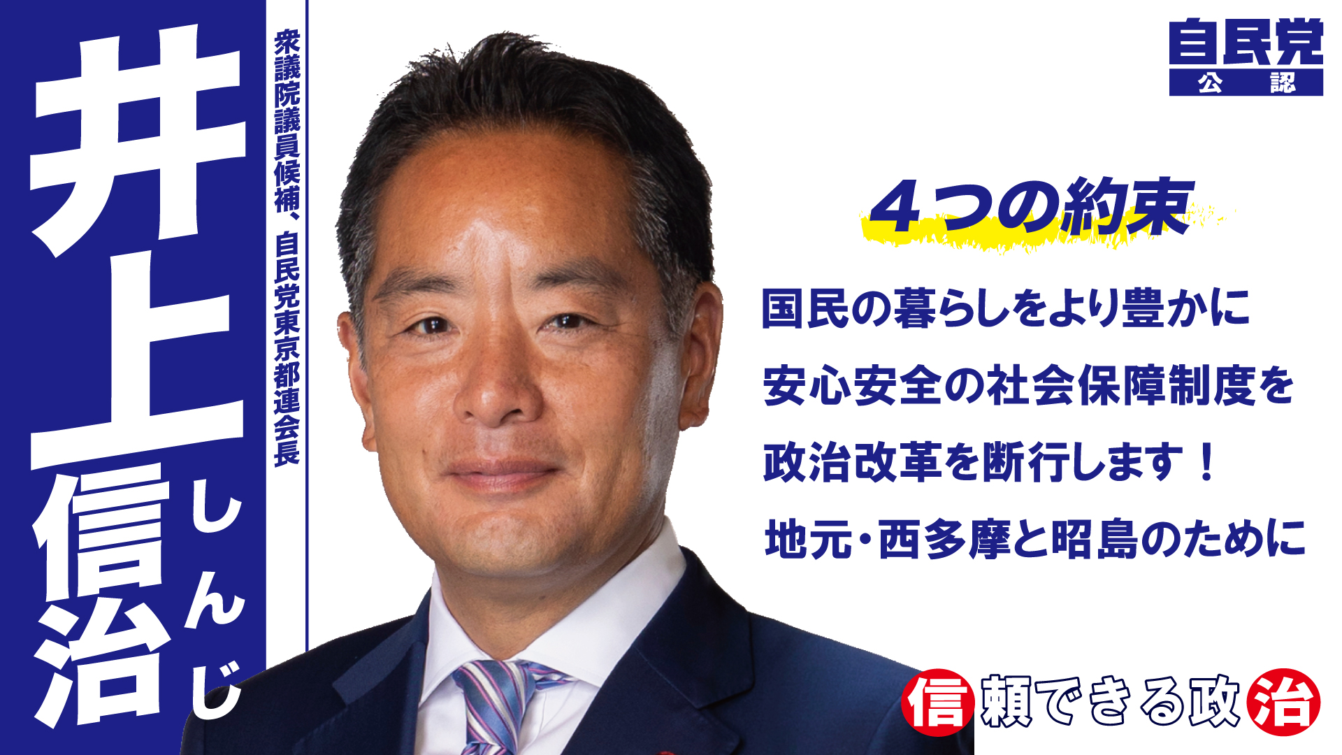 私たちの西多摩と昭島は、東京にありながら美しい自然と伝統文化に恵まれた素晴らしい地域です。経済や観光の振興、医療や教育の充実、防災の他、横田基地対策、JR各線の改善、多摩モノレールの延伸、国営昭和記念公園の活用などにも引き続き取り組みます。